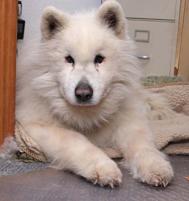 Kathy Thomas first told us of a second-hand report there was a Samoyed in the Kent shelter. A friend of hers went to check for a lost dog (since found) and saw him, so she wanted to be sure we knew. He had been picked up New Year’s Eve in Enumclaw, and was a senior male. Erin went in right away to make contact and found he was available for adoption on the 5th if his family didn’t come and claim him.